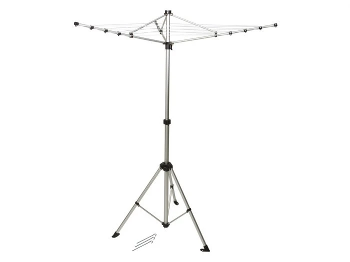 Deze droogmolen van Bo-Camp is een 3-arms model. Het is een licht gewicht droogmolen die wordt geleverd met voet. Doordat je de molen makkelijk kan opvouwen, is deze ideaal om mee te nemen tijdens het kamperen. De droogmolen wordt geleverd met drie haringen, waardoor je hem kan vastzetten in de grond. In totaal is de drooglijn 12 meter.Â