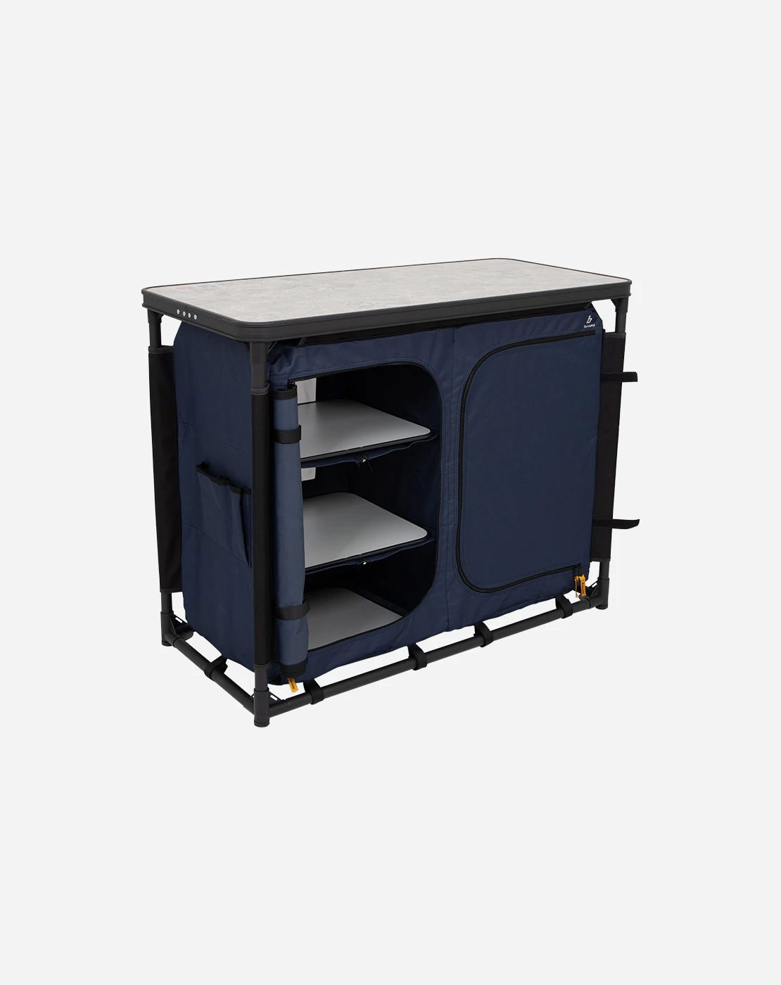 De duurzame constructie van het kookeiland zorgt ervoor dat je potten en pannen stevig blijven staan, met verstelbare poten die je maximale stabiliteit geven, zelfs op de meest oneffen kampeergrond. Denk bijvoorbeeld aan koken op een rotsachtige ondergrond of een zanderig strand – niets is een probleem voor dit eiland. Het stevige aluminium blad en het polyester doek zijn niet alleen onderhoudsvriendelijk, maar ook bestand tegen de elementen, zodat jij zorgeloos kunt kokkerellen.