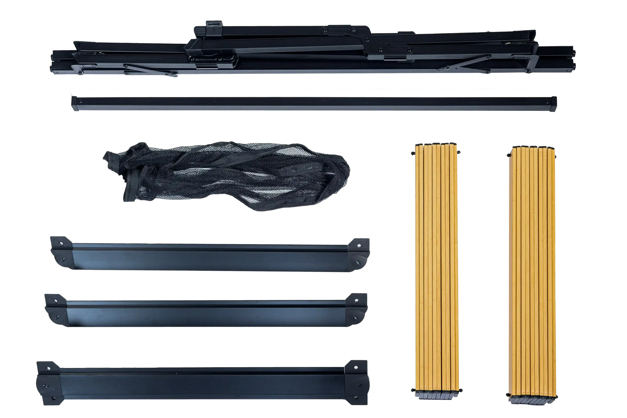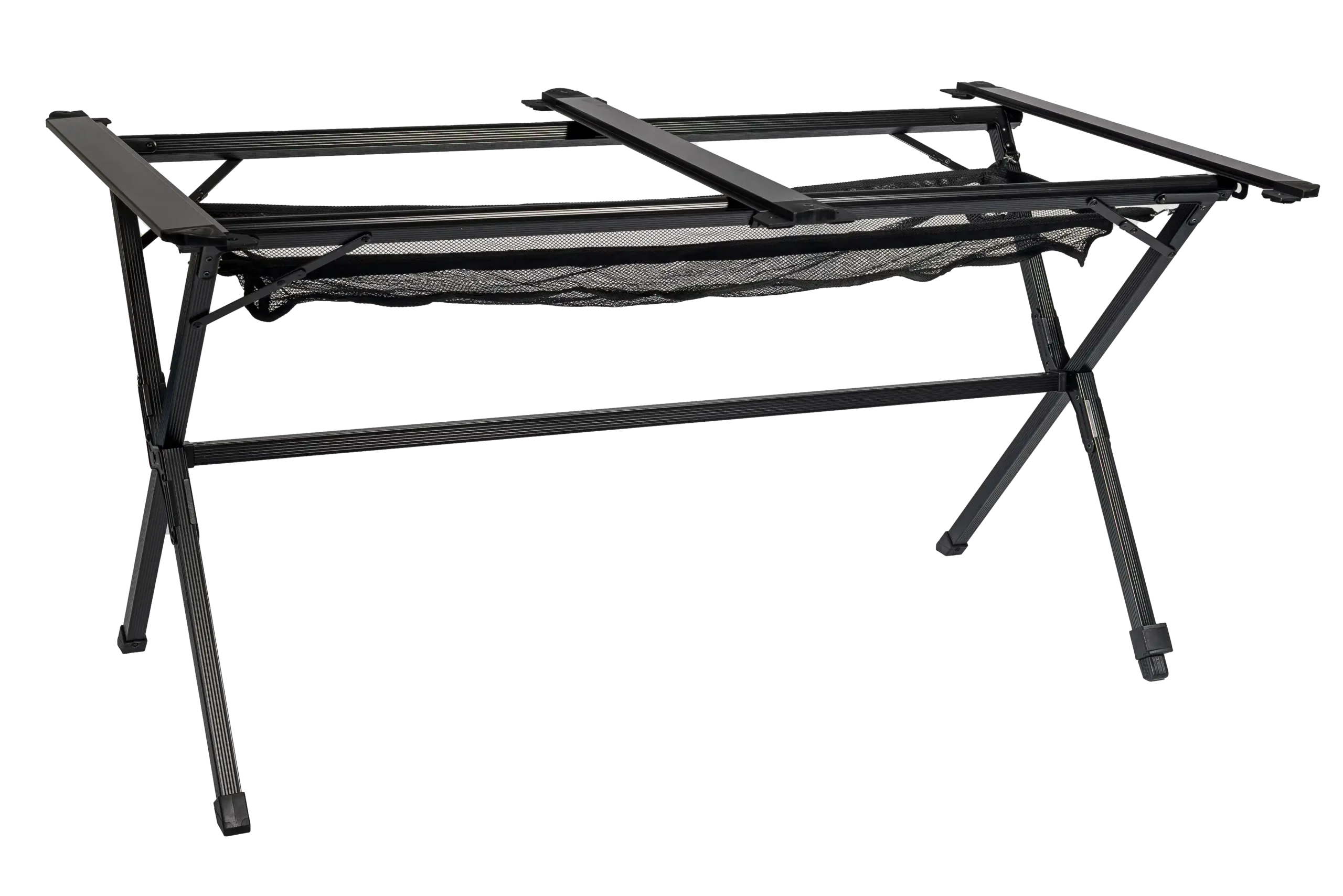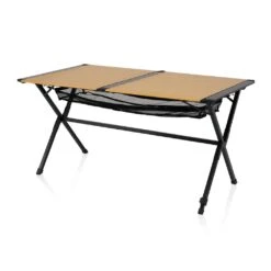 De Happy Rhino Roltafel Burleigh campingtafel beschikt over een hoogwaardig aluminium frame dat zorgt voor stabiliteit onder alle weersomstandigheden. Het tafelblad, dat in twee delen opgerold kan worden, biedt een eenvoudige opbergoplossing en is snel weer op te zetten door het simpelweg op het frame te klikken. De aluminium lamellen zijn ontworpen om bestand te zijn tegen alle weertypes, zodat je de tafel gerust buiten kunt laten staan.