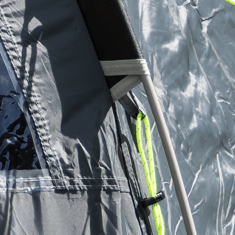 De tent is voorzien van extra sterke Dynaflex glasfiber stokken die minder snel splijten. De gekleurde scheerlijnen zijn duidelijk zichtbaar als het schemerig is.Â