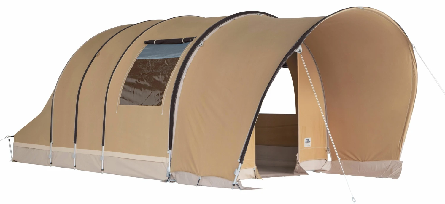 De tent is vervaardigd uit 100% katoenen Ten Cate tentdoek, wat zorgt voor een uitstekend ademend vermogen. Grote ramen aan beide zijden en meerdere ventilatiepunten zorgen voor een lichte en luchtige atmosfeer binnenin. De zijwanden zijn zo ontworpen dat je eenvoudig verschillende opbergsystemen kunt toevoegen, waardoor je de ruimte optimaal benut.