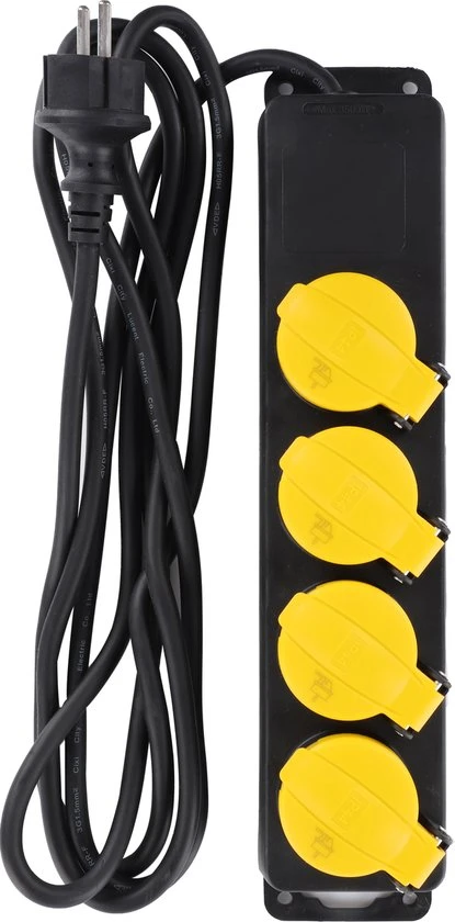 Spatwaterdichte contactdoos met 4 randaarde stopcontacten. De contactdoos is voorzien van een 3 meter lange kabel.