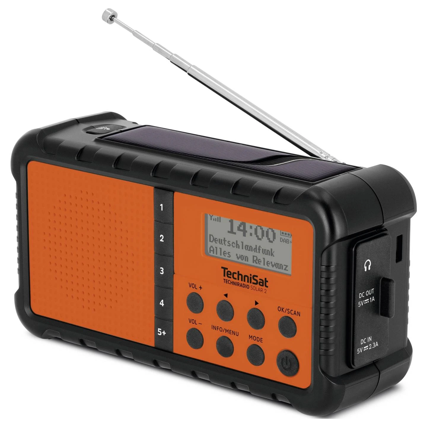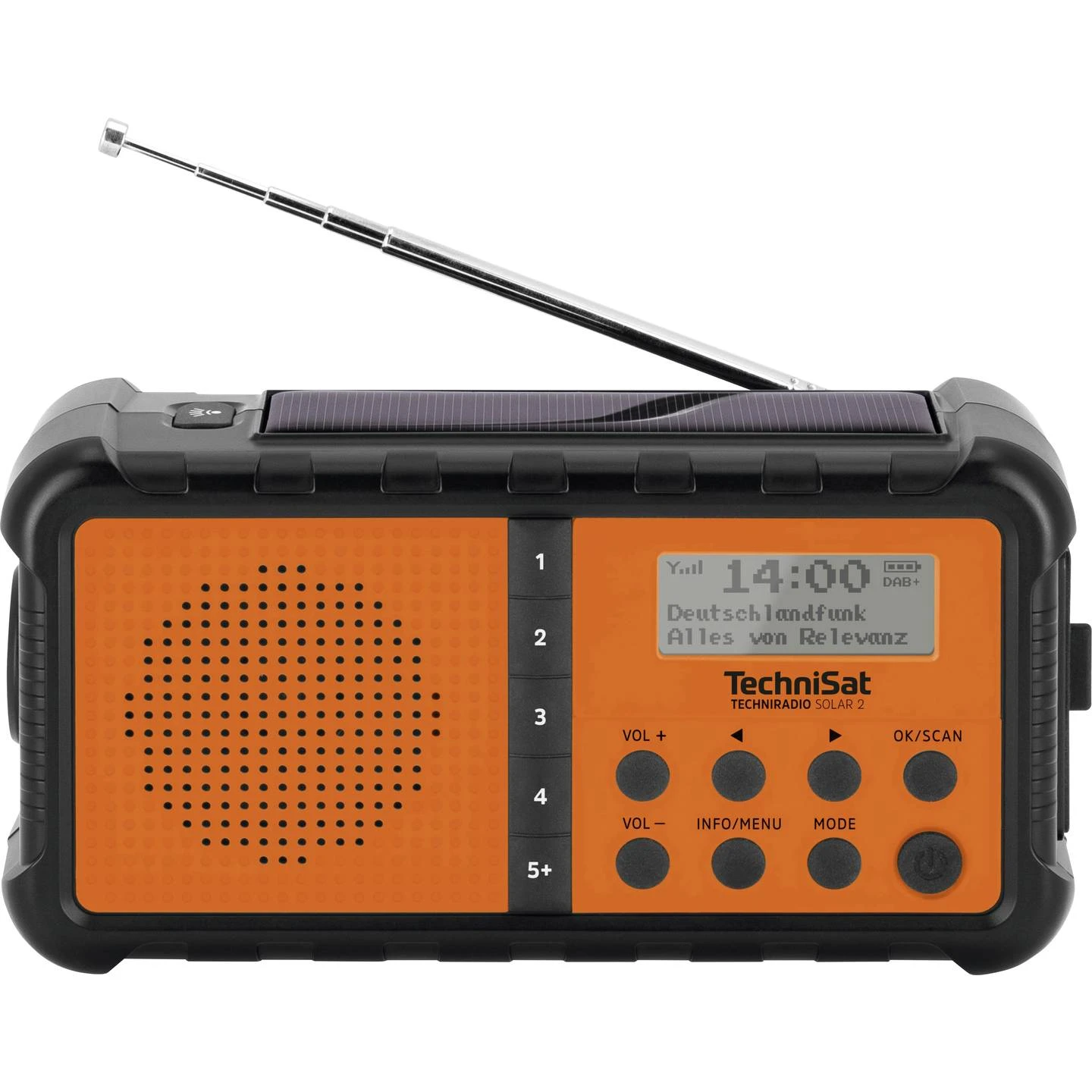 Met de TECHNIRADIO SOLAR 2 bent je voorbereid op elke situatie. Deze mobiele DAB+ / FM-radio slaat tot 10 favoriete zenders op, zodat je je favoriete station altijd binnen handbereik hebt. Met de 4 directe preset-knoppen heb je snel toegang tot je favoriete zenders. Als hij volledig is opgeladen biedt de ingebouwde accu (3,7 Volt / 3000 mAh) tot wel 25 uur muziek. Is de batterij leeg? Dan kun je deze op milieuvriendelijke wijze opladen via het geïntegreerde zonnepaneel of de handmatige slinger. Je kunt de radio ook opladen via de USB-C-poort. Via de USB-A-poort kun je er ook andere toestellen mee opladen. Een USB-C naar USB-A-kabel wordt meegeleverd.
