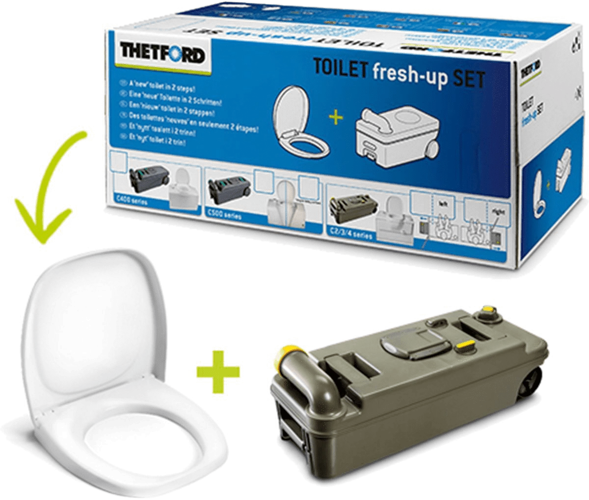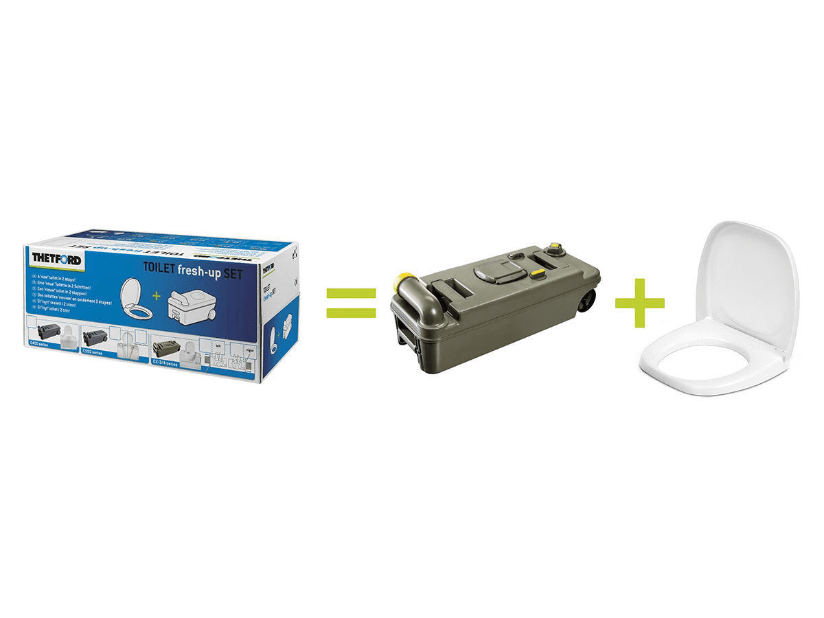 Heb je het gevoel dat je caravan-toilet wel een opfrisbeurt kan gebruiken? Zoek niet verder! Met de Thetford Fresh Up Set C234 LH geef je je toilet in no-time een complete make-over. Het mooie van deze set is dat hij niet alleen superpraktisch is door de wielen en het handvat, maar ook perfect past bij left-handed (linksdraaiende) toiletmodellen. Stel je voor: geen gesjouw meer met een zwaar toilet, gewoon lekker rollen naar waar je maar wilt!